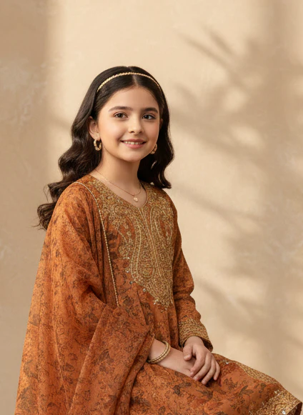 PRINTED EMBROIDERED POLY LAWN 3 PANEL WITH MIRROR WORK